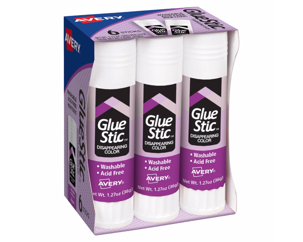 Barra Adhesiva Permanente No Tóxico, Lavable, Libre de Ácido. Las barras adhesivas Avery color púrpura permiten que al aplicar el adhesivo sobre la superficie, el mismo se pueda visualizar para luego saber donde aplicar el producto a pegar. Luego de unos minutos, el color púrpura desaparece.
