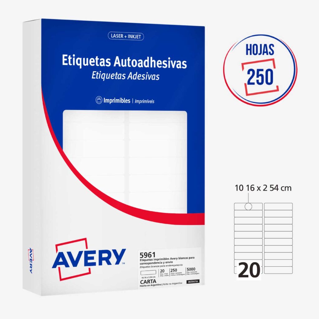ETIQUETAS ADHESIVAS IMPRIMIBLES AVERY BLANCAS CARTA 2.5 x 10.2 cm | 250 Hojas 20 Etq por Hoja