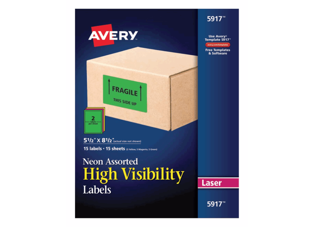 Etiquetas Imprimibles Avery Fluorescente para Correspondencia, Identificación Envío Colores Surtidos 5 fucsia, 5 amarillo, 5 verde. Los colores son intensos ideales para identificar y resaltar cajas, archivos u objetos y textos que se quieran resaltar.