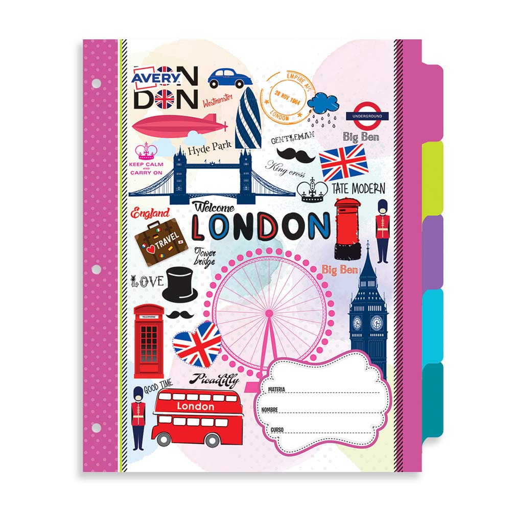Separadores personalizables de 5 posiciones. Con diseños exclusivos que hacen juego con las carpetas y etiquetas de la línea Avery. Margenes reforzados para mayor durabilidad.