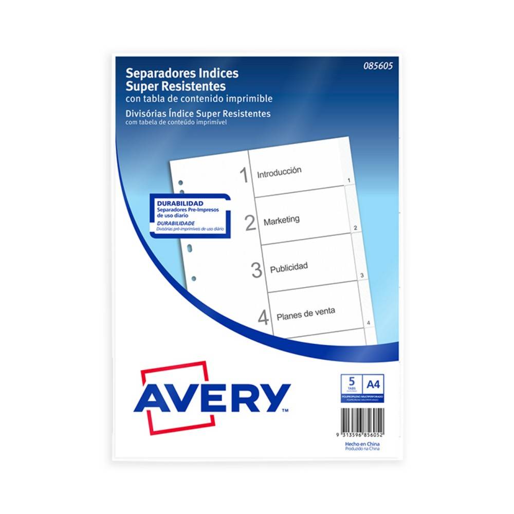 Separadores Índice Avery Súper Resistentes. Desarrollados en polipropileno para mayor resistencia y durabilidad. Incluyen una tabla de contenido para imprimir e identificar rápidamente cada sección. La línea completa incluye Lengüetas pre-impresas numéricas o alfabéticas. Perforación Universal. Incluye tabla de contenido para personalizar e identificar cada sección.