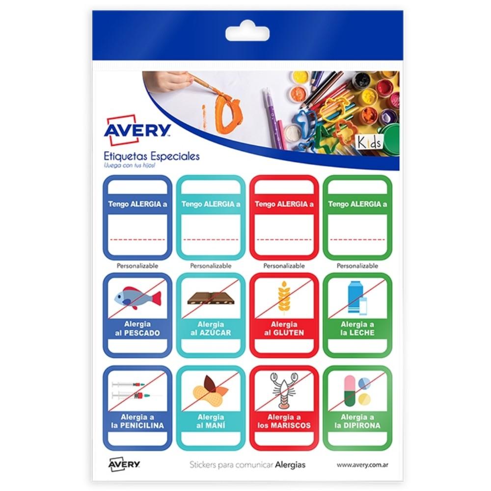 Etiquetas Avery para Comunicar Alergias - Incluye 4 Stickers Avery para personalizar - Se adhieren a diversas superficies: ropa, mochilas, viandas, cuadernos, etc - Se pueden escribir con marcador permanente.
