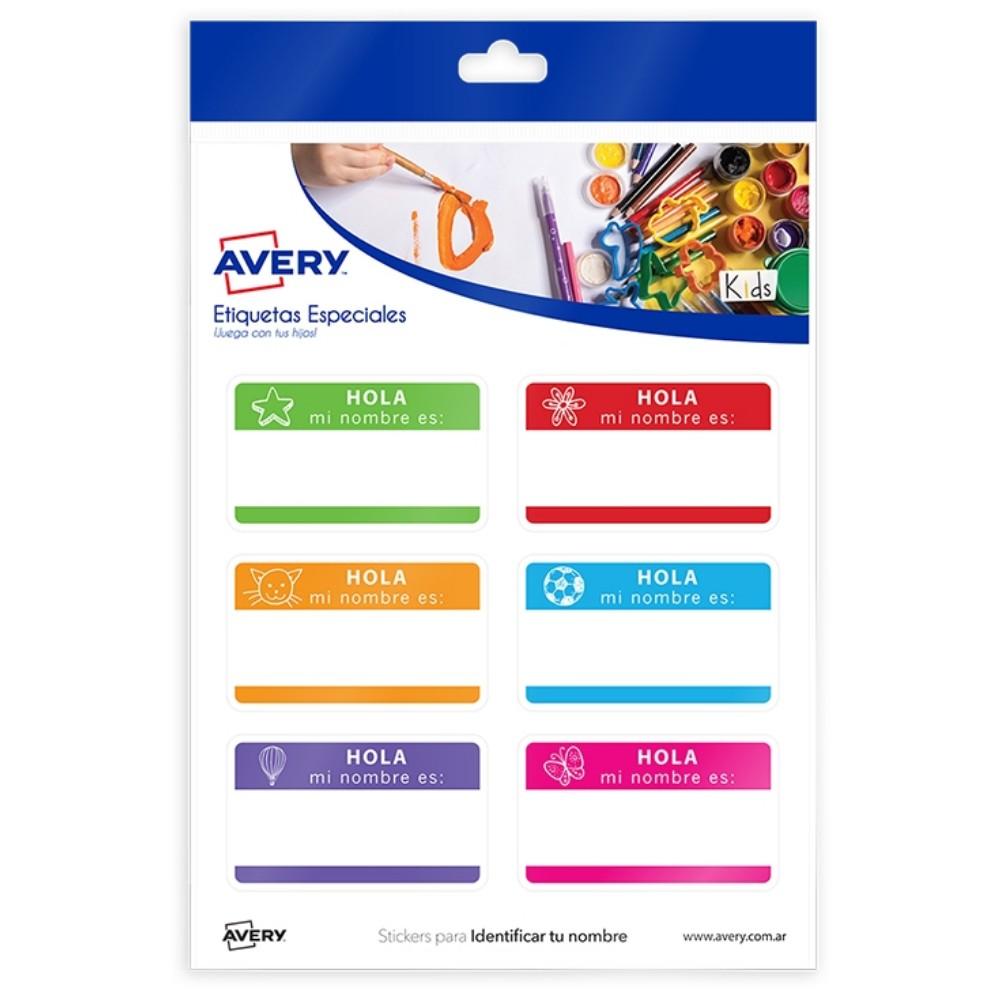 Etiquetas Avery para Identificar Tu Nombre - Se adhieren a diversas superficies, se puede aplicar sobre la ropa y se puede remover facilmente. Impresos en Papel Ilustración de diferentes colores.