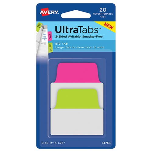 UltraTabs Avery Big Tab Reposicionables. 20 Tabs flúo. Su material translúcido, semi-rígido y de escritura manual en ambos lados las hacen únicas en el mercado! Ideales para indexar y referenciar material de lectura, Identificar y visualizar rápidamente secciones especiales en libros y documentos. Son reposicionables y resistentes. Se pegan y despegan con facilidad. Cuerpo translúcido para ver el texto a través de él. Lengüetas de Color, que se pueden escribir de ambos lados. Permiten escritura con lápiz, bolígrafo, resaltador o marcador.